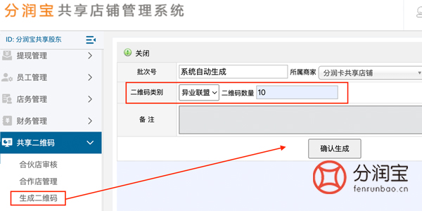 共享二维码,都是直接在共享店铺系统后台生成的。找到“共享二维码”,点击“生成二维码”,选择“二维码类别”,填写“二维码数量”、“备注”,确认生成。