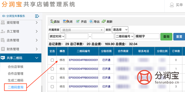 然后点击“修改”,将图中二维码分享给合作商家,让店主扫码填写相关信息。