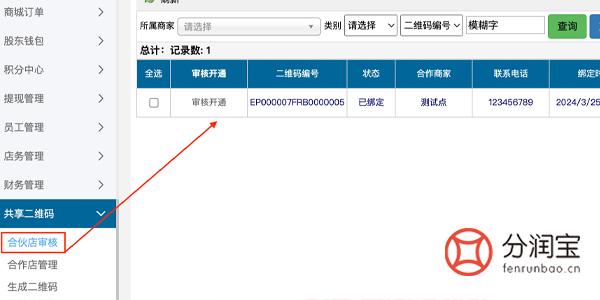 商家店主填写信息之后,在合作店审核中,确认信息“审核开通”,进去内页开通分账权限。