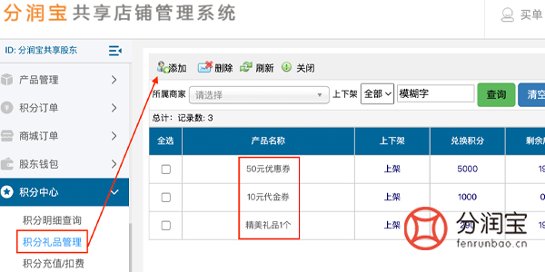 在共享店铺系统中,积分中心,设置积分礼品,可以添加很多个,展示在手机端积分商城。顾客按照商城兑换积分数量兑换成功,然后向店员出示核销码,店员扫码核销。