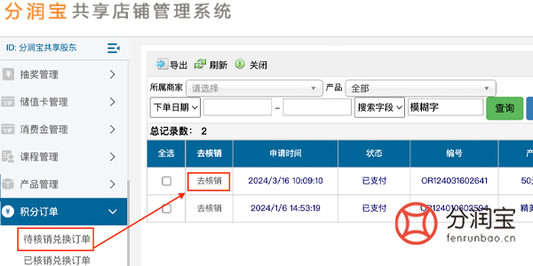若是线上邮寄的订单,可以选择积分订单中,带核销兑换订单>去核销>确认核销。