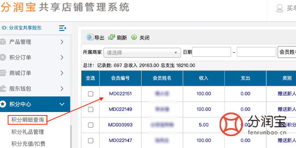 相关的股东会员积分明细,通过积分中心中的积分明细查询,会员姓名、收入、支出、类别、时间等都能详细查询到。