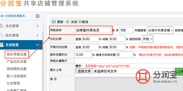 在共享店铺系统中设置等级,系统配置>股东等级设置>添加,填写“等级名称”,更新。之后有活动需要可以按需填写“分红比例”、“股东优惠折扣”、“储值卡买单优惠”等。