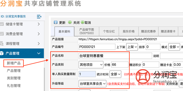 然后新增66元消费链接,在产品管理中,新增产品,填写“产品名称”、“单人购买数量”、“升级等级”。顾客在手机端直接购买成功,就能成为台球室共享会员了。
