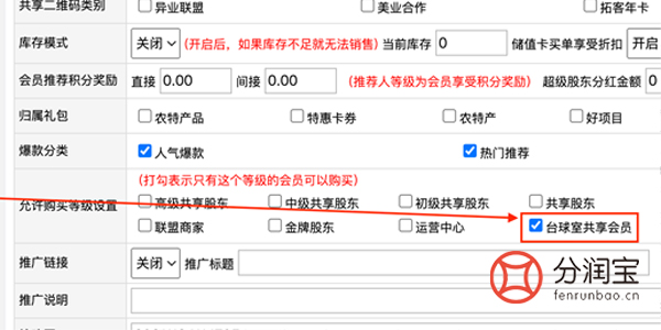 再加一个一元链接,按需求填写相关的基本资料,在“允许购买等级设置”位置,勾选台球室共享会员。也就是只有升级为台球室共享会员的顾客,才能购买此链接,享受此福利。