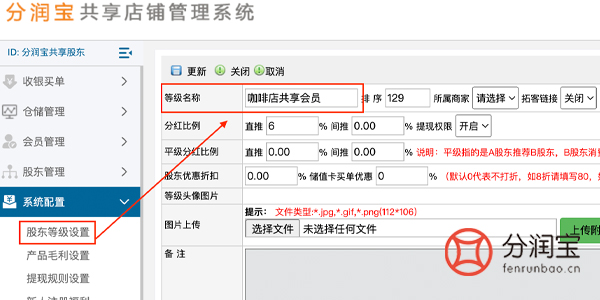 成为咖啡店共享会员,享受分红比例,推广分享越多,所得分红收益越多。在共享店铺系统中可以设置几个等级的共享股东等级,点击系统配置>股东等级设置,添加,填写“等级名称”、“分红比例”,更新。