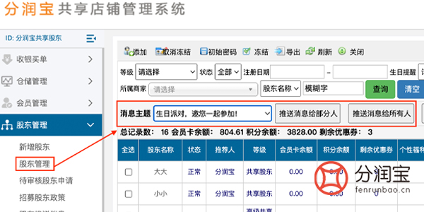 股东会员的推荐人、等级、会员卡余额、积分余额、声音优惠券等等,都能在后台查询到的。还可以针对不同的等级推送专属的福利消息,玩转私域。在股东管理中,点击股东管理,选择消息主题,选择推送个单个会员或所有会员。