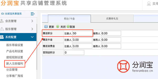 以上的共享股东模式,都是通过共享店铺系统后台设置的。在系统配置>新人注册福利,填写“赠送积分”,更新。