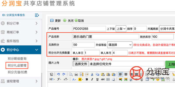 然后在积分中心上架积分商品,找到积分礼品管理,填写“产品名称”、“兑换积分”、“剩余库存”、“积分允许兑换数量”、“单人单月兑换数量”,更新。