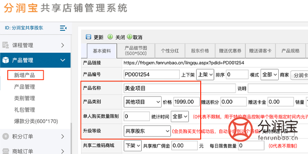 然后在产品管理,新增产品,填写“产品名称”、“价格”、“单人购买数量”,选择“产品类别”、“升级等级”,更新。