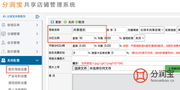 系统后台能设置很多不同等级的共享股东,每个共享股东的分红比例不一样,等级越高,分红比例越高。(如图所示)