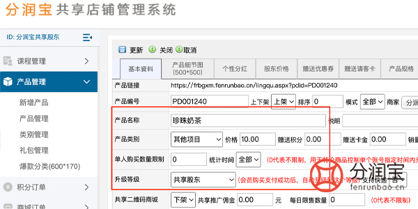 设置商品链接,上架的商品都是展示在共享店铺商城上,供顾客购买的。当推荐的顾客购买成功,共享股东推荐人可以活动相应的分红。相关设置,如图所示。