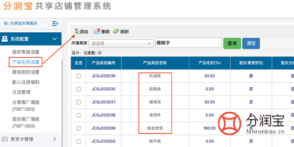 在共享店铺系统中设置毛利百分比,找到系统配>产品毛利设置,添加。填写“产品类别名称”、“产品毛利”,保存。