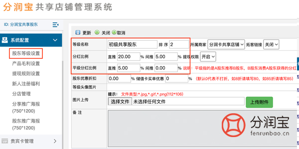 然后设置股东等级,在系统配置>股东等级设置,添加,填写“等级名称”、“分红比例”、“平级分红比例”,可以按门店规则填写“股东优惠折扣”、“储值卡买单优惠”等,更新。