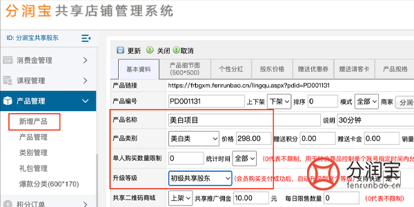 这些设置完成之后,就是上架商品,在产品管理中>新增产品,填写“产品名称”、“价格”、“赠送积分”、“赠送卡金”、“单人购买数量”,选择“产品类别”、“升级等级”,更新。