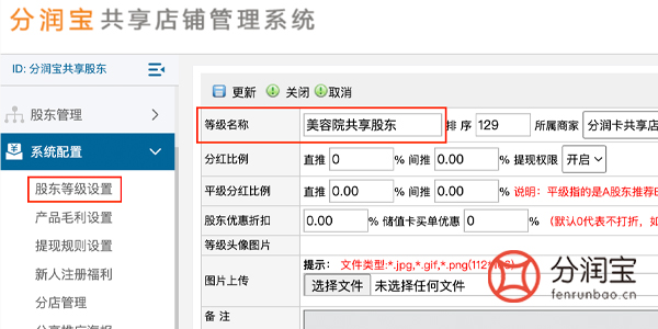 以上活动的充值赠送,都是通过共享店铺系统实现的。首先设置股东等级,在系统配置中,找到股东等级设置,填写“等级名称”,更新。