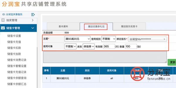然后赠送优惠券礼包,选择“主题”(需先在贵宾卡管理中添加)、“绑定股东”、“使用对象”、“类型”,填写“有效期”、“数量”,添加。充值成功此优惠券,是直接到账手机贵宾卡卡页面。共享股东可以自己使用过赠送好友使用,到店出示二维码,店员扫码核销即可。