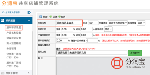 相关活动都是通过共享店铺系统配置的,找到系统配置,股东等级设置,添加。填写“等级名称”,更新。