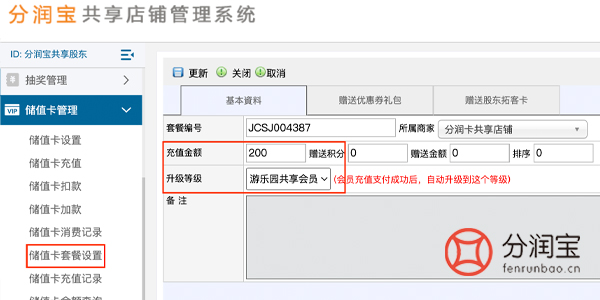 然后在储值卡管理中,添加储值卡套餐设置,填写“充值金额”,选择“升级等级”,更新。顾客通过门店扫码二维码,在共享店铺商城充值成功,就直接升级成为游乐园共享会员了。