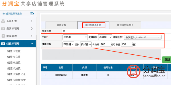 在贵宾卡管理中添加贵宾卡主题之后,在如下页面赠送优惠券礼包,填写“主题”、“有效期”、“数量”,选择“使用对象”、“类别”,添加/更新。充值成功赠送的券,也直接到手机端贵宾卡页面中了。