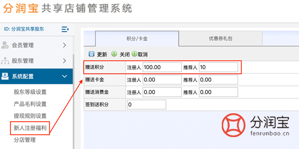 在共享店铺系统后台,找到系统配置,设置新人注册福利,填写“赠送积分”,更新。如图所示