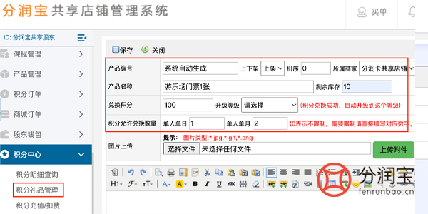 商家在共享店铺后台设置积分礼品,找到积分中心,积分礼品管理,添加。填写“产品名称”、“剩余库存”、“兑换积分”、“积分允许兑换数量(单人单日/单人单月)”,保存。顾客注册成功之后,获得积分,可以在手机端积分商场,直接兑换游乐园门票。