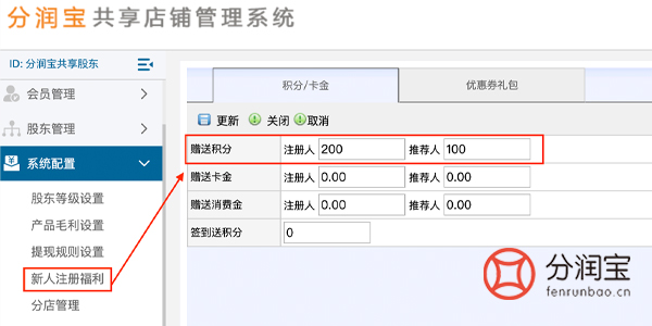 其中积分的相关设置,都是通过共享店铺系统设置的。系统配置>新人注册福利,填写“赠送积分”、“推荐人”,更新。顾客在门店完成消费,扫码注册成功直接活动200积分。