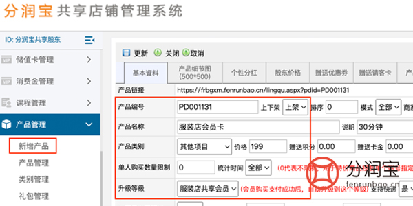 上架服装店会员卡,在产品管理中,新增产品。填写“产品名称”、“价格”,选择“产品类别”、“升级等级”,更新。顾客在共享店铺手机端,成功购买会员卡,成为其共享会员。