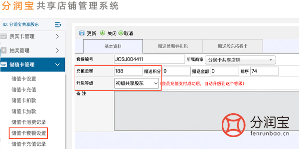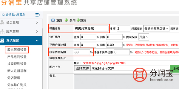 此方案的充值活动都是通过共享店铺系统设置的,股东等级可以设置多个。相关设置如图所示