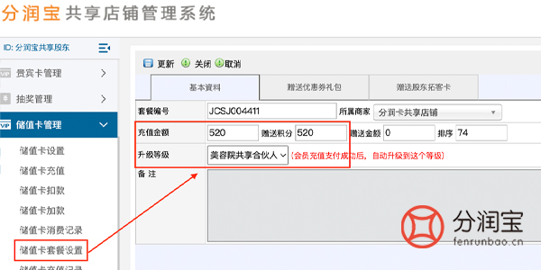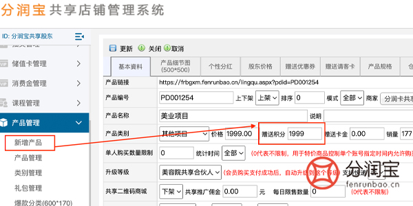 2. 在共享店铺手机端获取积分的方式有很多种,购买商品赠送积分,充值赠送积分,推广新人赠送积分。共享店铺系统后台,相关设置如图所示。