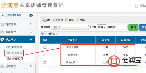 共享店铺系统中,积分商品可以添加很多个,每个商品所需的兑换积分不同。顾客在共享店铺手机端直接用获得的积分即可兑换成功,相关设置如图所示。