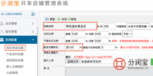 在共享店铺系统后台,添加养生馆共享会员,股东等级。把“股东优惠折扣”填写好,更新。