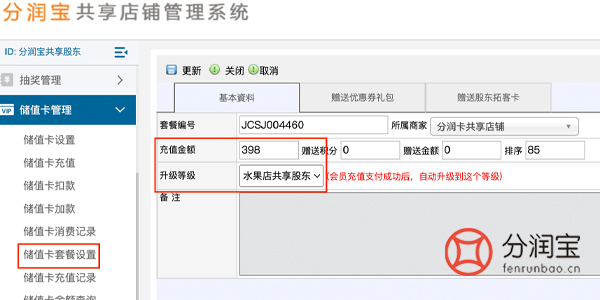 在共享店铺系统中,添加充值套餐,填写“充值金额”,选择“升级等级”,更新。顾客在手机端充值成功,直接成为水果店共享股东。