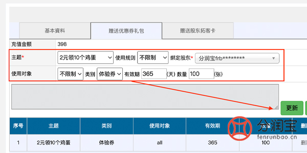 在贵宾卡管理中,添加好贵宾卡主题。然后在储值卡套餐设置中,赠送优惠券礼包,选择“主题”、“绑定股东”、“使用对象”、“类别”,填写“有效期”、“数量”,添加。