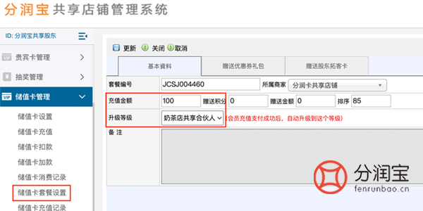 在共享店铺系统中设置好充值活动套餐,在储值卡管理中>储值卡套餐设置,填写“充值金额”,选择“升级等级”,更新。