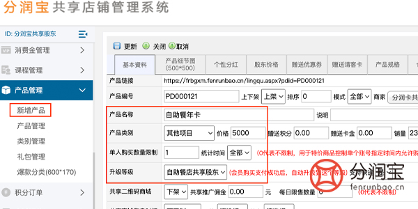 在共享店铺系统后台,上架自助餐年卡,顾客共享店铺手机端支付成功,直接成为自助餐店共享股东。设置如图所示