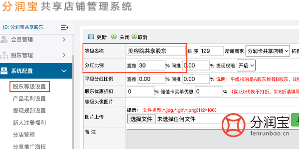 在共享店铺系统设置,系统配置中,股东等级设置,填写“等级名称”、“分红比例”,更新。