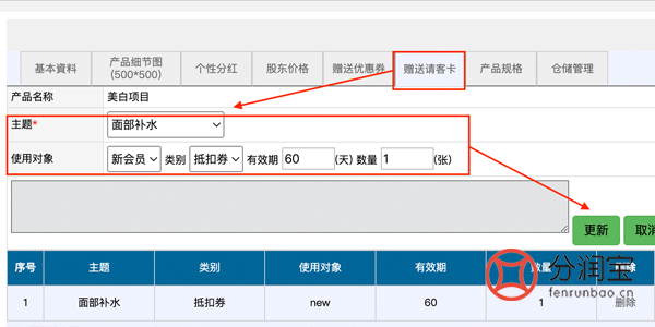 在设置请客卡时,商家需要填写产品基本信息,如产品名称、产品价格、说明、产品类别、赠送积分、赠送卡金等。这些信息填写完成后,更新成功,就可以找到赠送请客卡的选项进行设置。