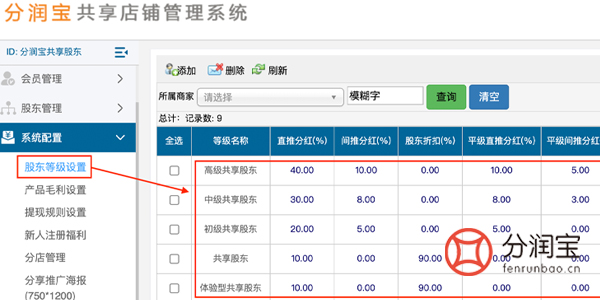 在共享店铺系统中设置好股东等级,根据股东等级不同,其分红比例也不同,当然等级越高直推/间推分红越高。