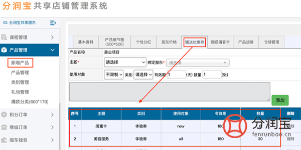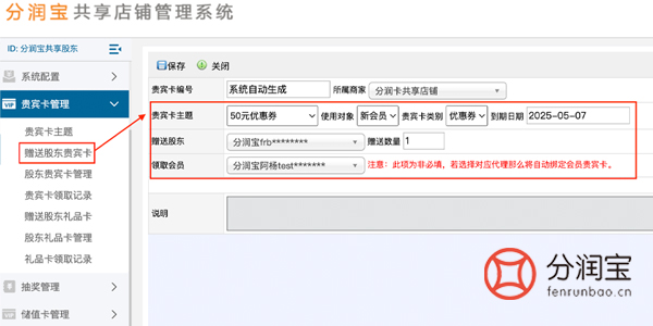 在贵宾卡管理中添加好贵宾卡主题之后,可以通过后台赠送股东贵宾卡,选择“贵宾卡主题”、“使用对象”(若选择新会员即只能新会员使用,若选择不限制即新老会员都能使用)、“优惠券类别”、“赠送股东”、“领取会员”,填写“赠送数量”、“说明”,保存。