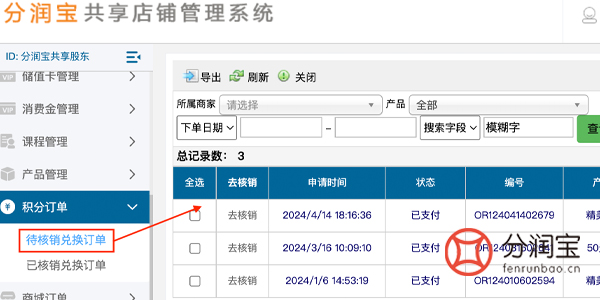 顾客在手机端积分商场页面用积分兑换成功之后,商家运营者在共享店铺系统后台,找到积分订单选择待核销兑换订单,去核销,核对兑换详情,点击确认核销。即核销成功,系统将自动扣除兑换礼品所用的积分数量。