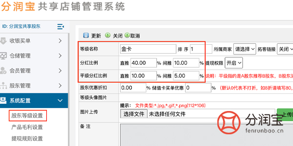 也就是在共享店铺系统后台把股东等级先设置好,把预定好的卡项名称,分红比例等全部添加上。