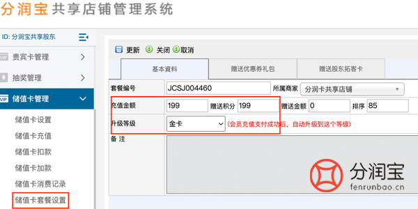 在储值卡管理中,找到储值卡套餐设置,添加,填写“充值金额”、“赠送积分”,选择“升级等级”,更新。