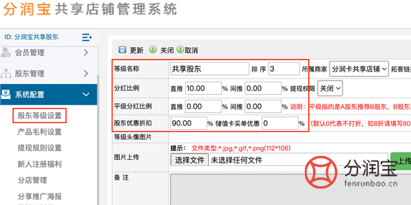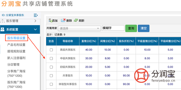 利润分红:共享股东通过引流客户到门店消费可以获得利润分红。这意味着共享股东将获得其贡献业务量所对应比例的盈利分成。相关设置如图所示