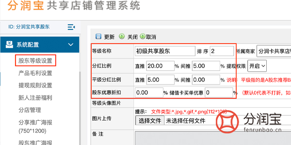 设定共享股东享受权益:顾客成为共享股东之后,分享推广好友购买,享受好友消费的分红收益。股东等级越高,享受分红比例越高,股东还可以享受股东优惠折扣及储值卡买单优惠等。