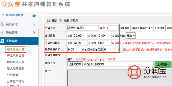 通过共享店铺系统后台的设置,顾客消费之后即可自动成为对应等级的共享股东,享受共享股东权益。相关设置如图所示