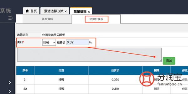 政策添加好之后,在结算价模版中添加,扫码结算价,分配给对应的代理政策和结算价,指定代理不同结算价不同,即可赚取扫码分润的差价。