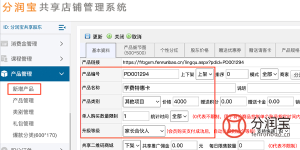 新增产品,填写“产品名称”、“价格”、“单人购买数量限制”,选择“产品类别”、“统计时间”、“升级等级”,更新。