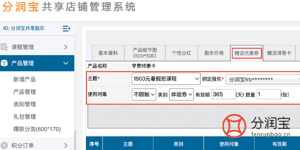 产品基本信息保存成功之后,赠送优惠券,选择“主题”、“绑定股东”、“使用对象”、“类别”,填写“有效期”、“数量”,添加。