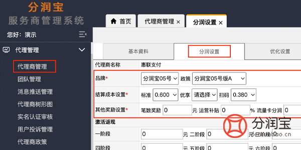 在支付分润系统中通过代理商分润设置,配置给下级代理不同的分润,获得其中的分润差价。还可以通过流量卡设置获得分润差价。